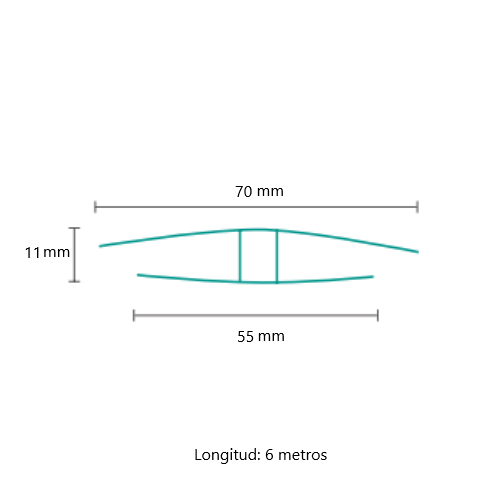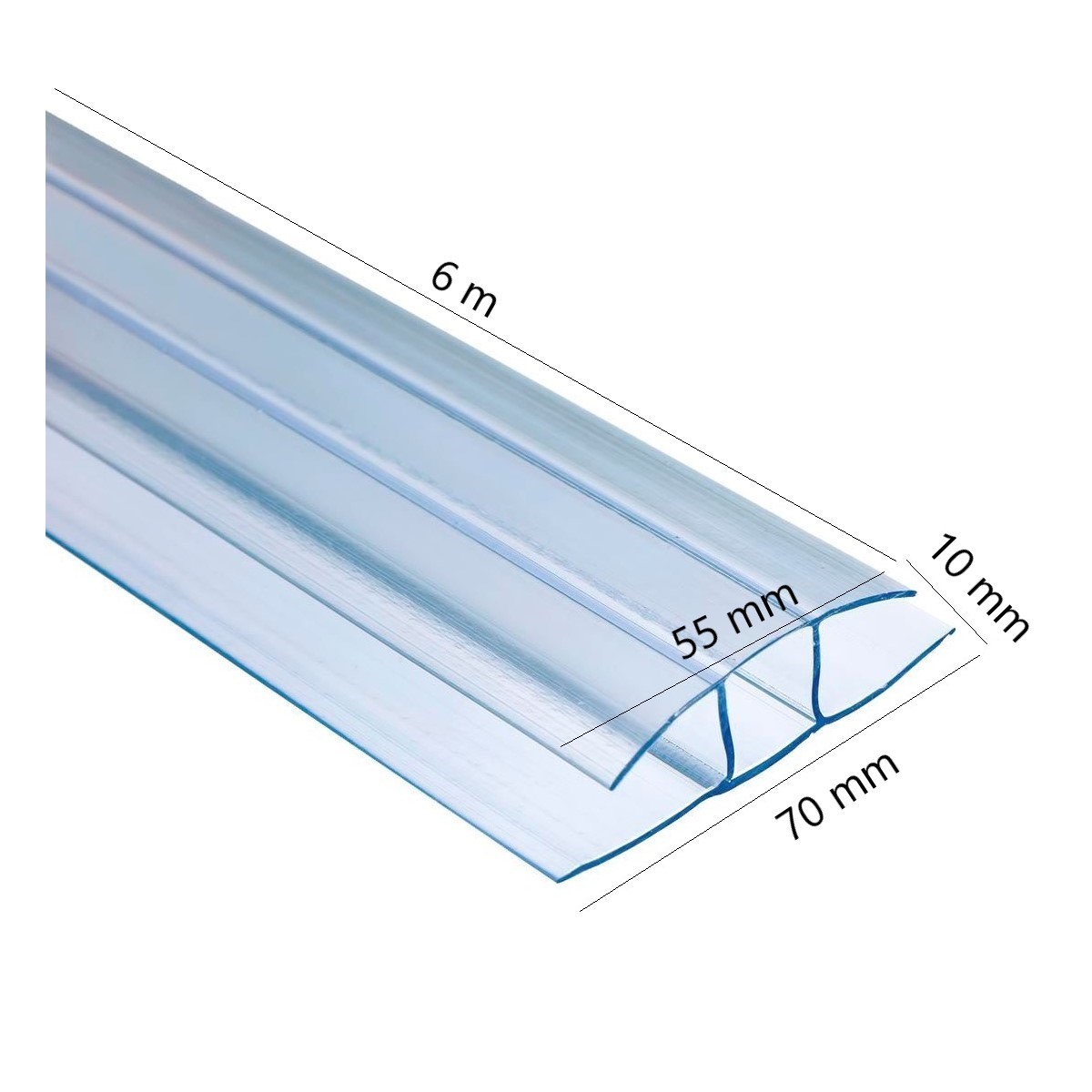 Perfil para la unión de diferentes placas de policarbonato de 10 mm, no portante, no apto para ser sometido a carga. Su función es unir láminas de manera longitudinal y transversal para obras de pequeña envergadura.